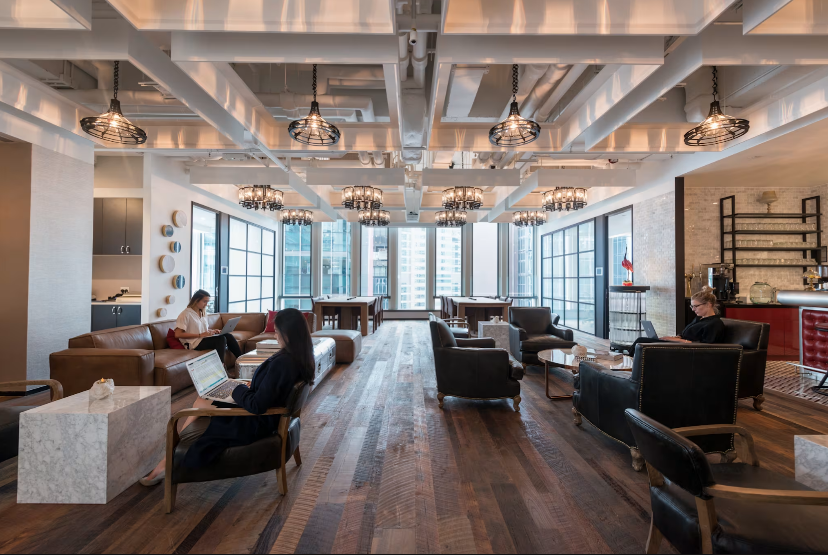 德事服务式办公室位于中环华懋中心二期 5-19 楼,提供灵活办公方案,结合开放式工位与共享办公区,打造极具吸引力的商务环境,满足企业多样化需求。